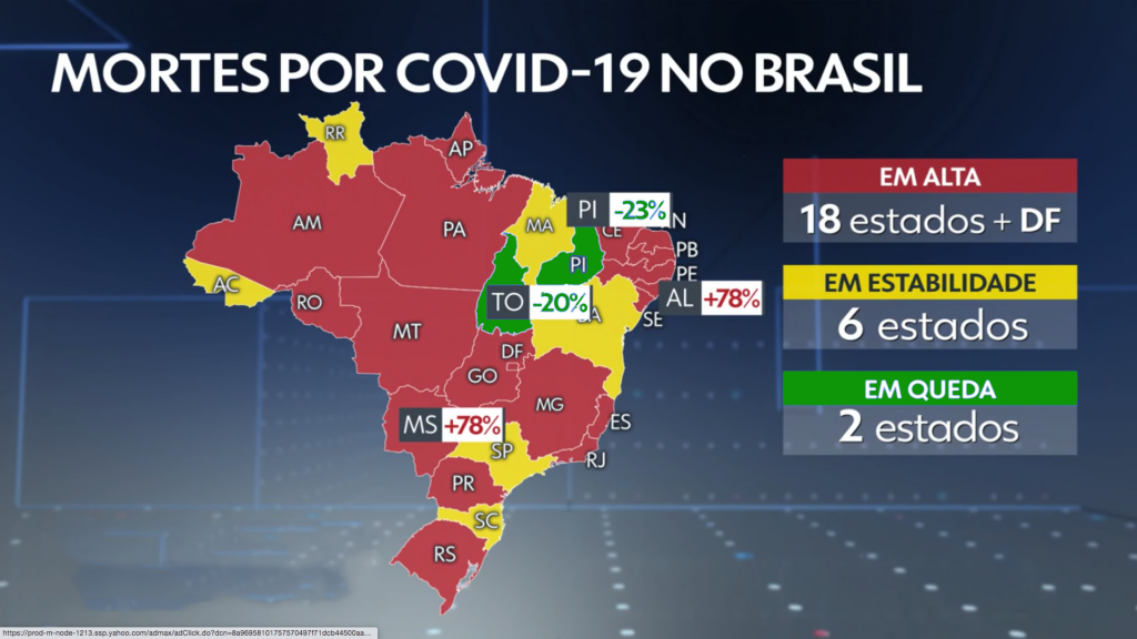 - Em estabilidade, ou seja, o número de mortes não caiu nem subiu significativamente (6 estados): SC, SP, AC, RR, BA e MA
