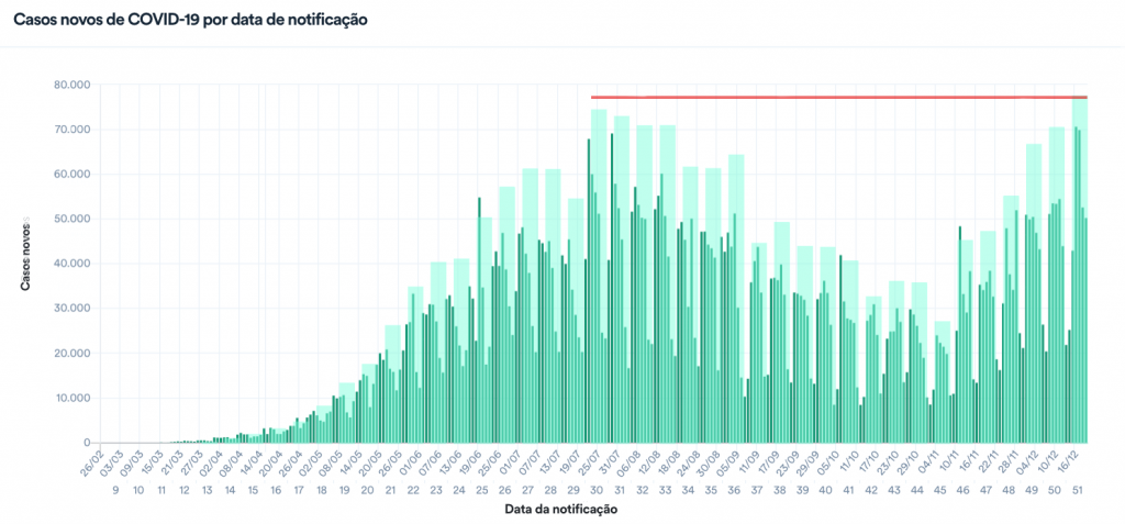 O Brasil registrou neste sábado a maior média móvel de casos em toda a pandemia: 47.575, com aumento de 15%, considerado o limite da estabilidade. A maior média móvel até então, havia sido na última semana de julho, com 45.664 infecções por dia.
