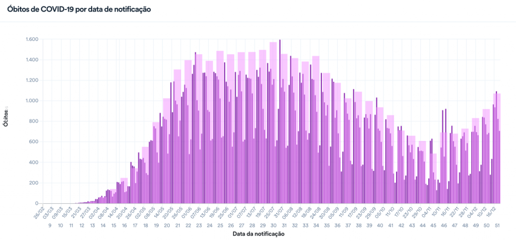 A média móvel de mortes está em 746, com aumento de 27%, considerado alta de óbitos.