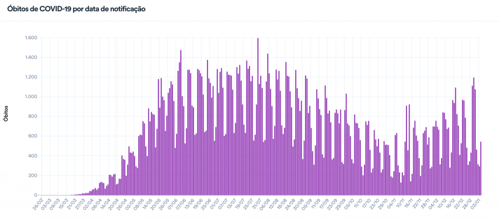 Em geral, os registros de casos e mortes são menores aos domingos e segundas-feiras em razão da dificuldade de alimentação dos dados pelas secretarias de Saúde aos fins de semana. Já às terças-feiras, os totais tendem a ser maiores pelo acúmulo das informações de fim de semana que são enviadas ao ministério.