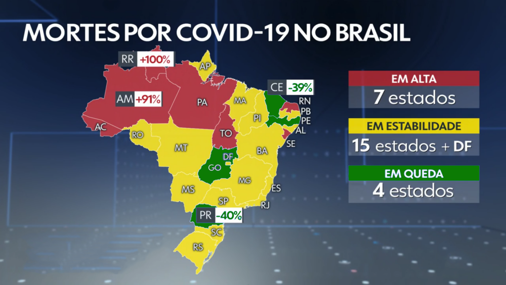 Números nacionais apontam queda no contágio, mas alerta está na quase totalidade da região Norte com aceleração de óbitos.