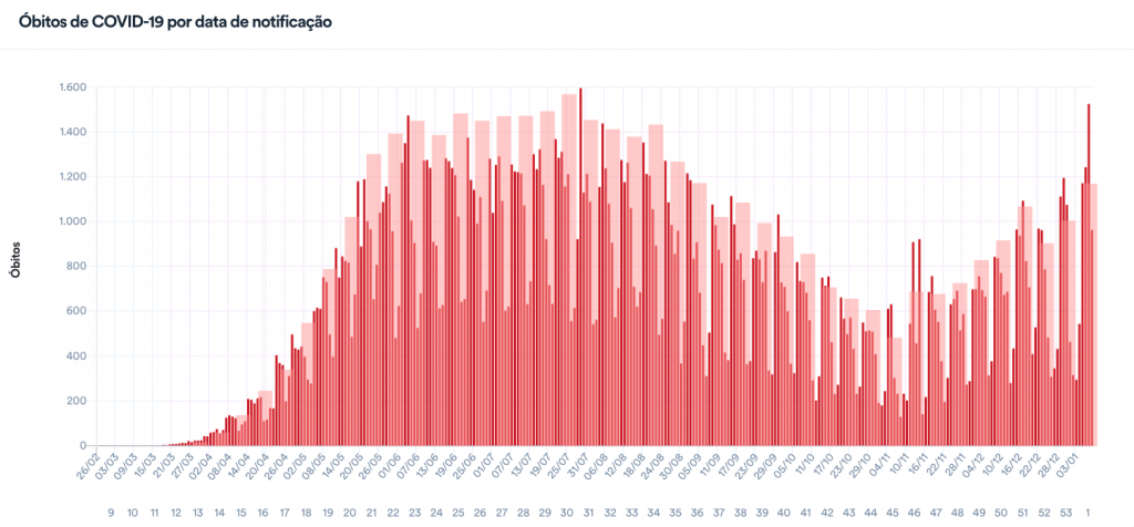 Na semana do ano-novo, as mortes por covid-19 aumentaram 11% e os casos ficaram estáveis, com oscilação de -1%. Com isso, a curva de óbitos, que havia apresentado queda na semana do Natal, voltou a subir.