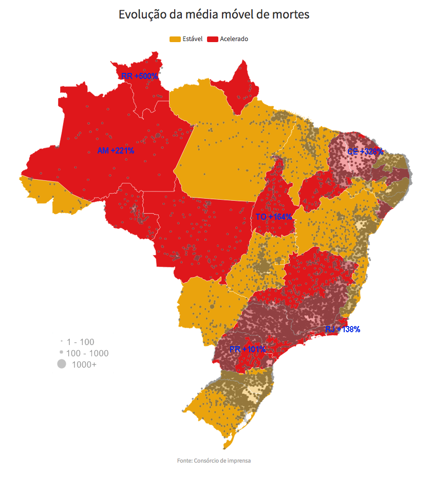 Novamente o país tem nenhum estado em queda na média móvel – um feito inédito até a última sexta-feira. Catorze estados tiveram aceleração, enquanto doze mais o Distrito Federal mantiveram estabilidade.