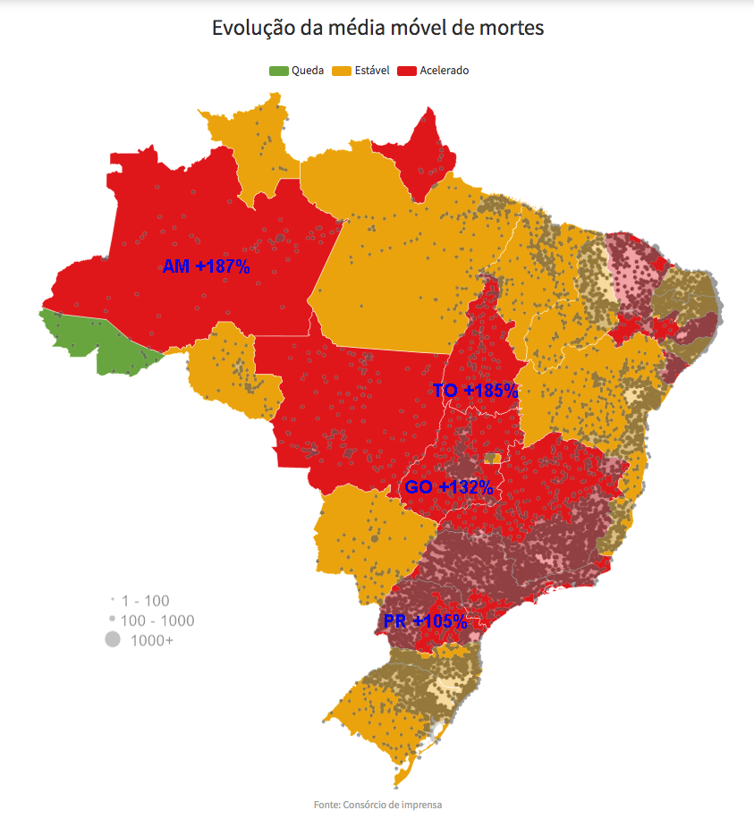 Doze estados estão com alta nas mortes: PR, MG, RJ, SP, GO, MT, AM, AP, TO, CE, PE e SE. Todas as regiões apresentaram aceleração: Centro-Oeste (16%), Nordeste (19%%), Norte (78%), Sudeste (53%) e Sul (32%).