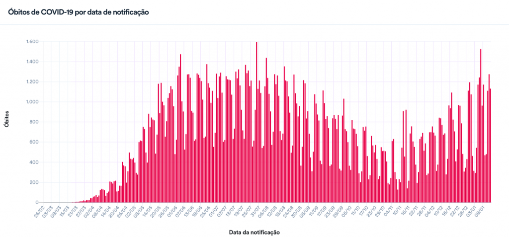 Em média, 964 pessoas morreram nesta semana em decorrência da doença, o que representa uma aceleração de 37% na comparação com 14 dias atrás. Hoje o país completa oito dias com tendência de alta, segundo cálculos do consórcio da imprensa.