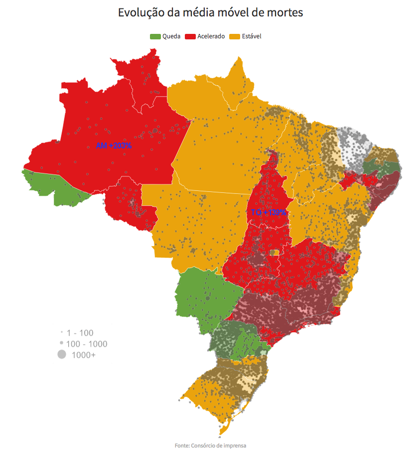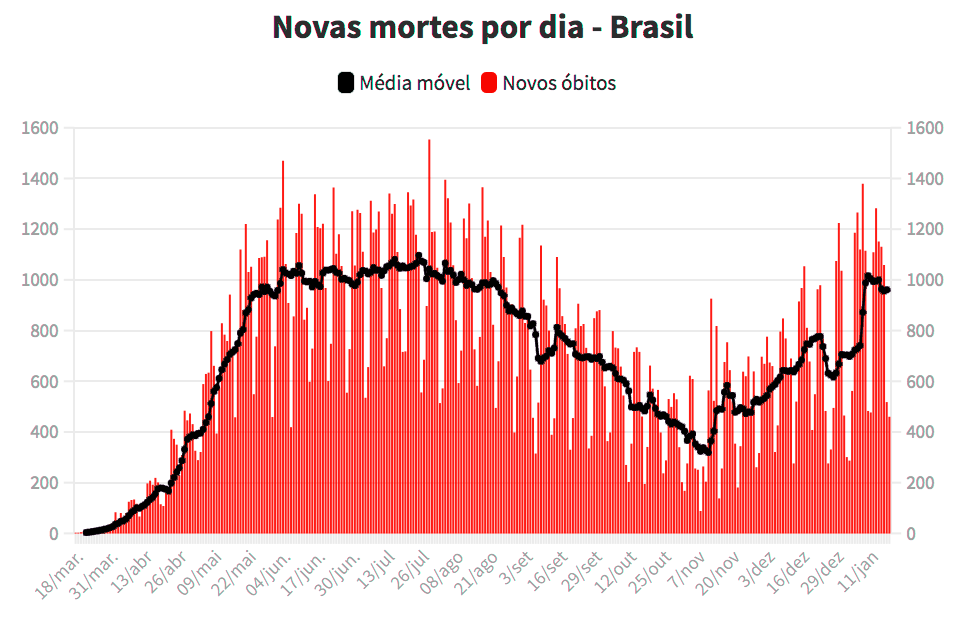 A média móvel de mortes no Brasil nos últimos sete dias foi de 959, segundo cálculo do consórcio da imprensa. A variação foi de +33% em comparação à média de 14 dias atrás, indicando tendência de crescimento nos óbitos pela doença.