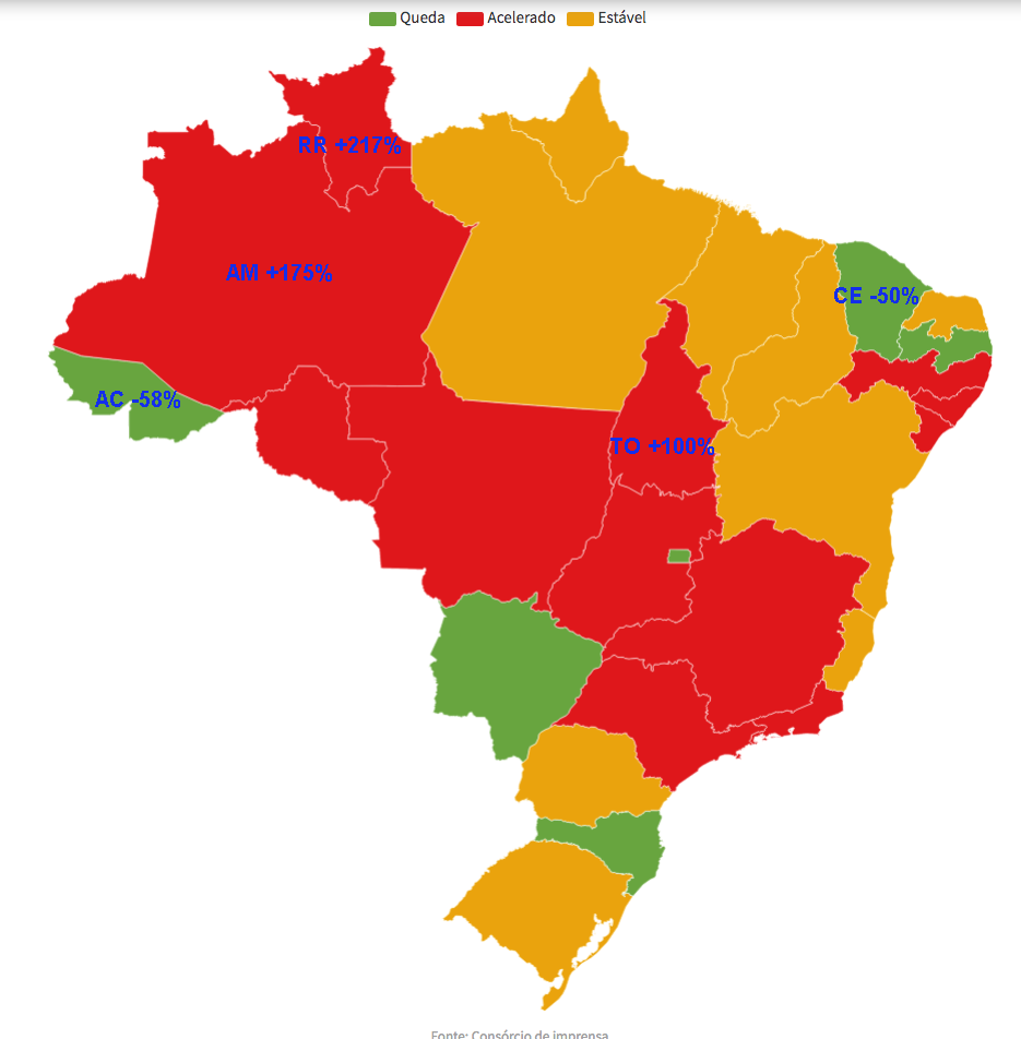 Doze estados estão com alta nas mortes: MG, RJ, SP, GO, MT, AM, RO, RR, TO, AL, PE e SE.
