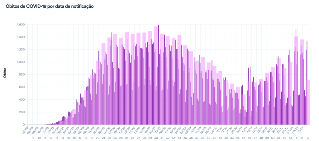 O Brasil teve nesta quarta-feira o dia com o segundo maior número de novas mortes registradas em 2021. Em 24 horas, foram notificados 1.340 novos óbitos por covid-19. O resultado ficou atrás apenas do dia 7 de janeiro, quando foram confirmadas 1.524 novos falecimentos.