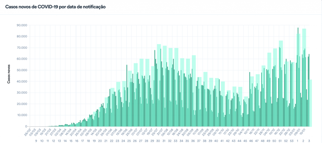 A média móvel nos últimos 7 dias foi de 54.630 novos diagnósticos por dia. Isso representa uma variação de +50% em relação aos casos registrados em duas semanas, o que indica tendência de crescimento também nos diagnósticos.