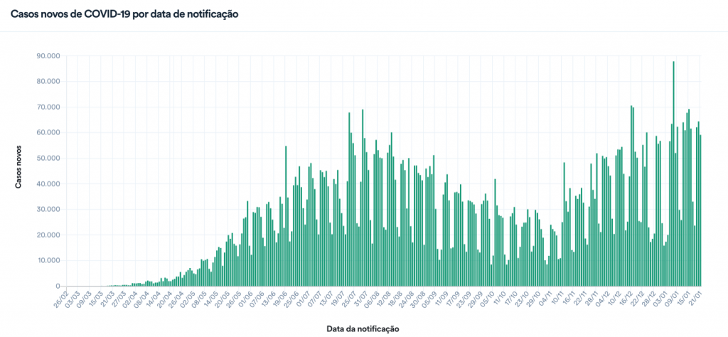 O número de pessoas infectadas desde o início da pandemia subiu para 8.697.368. Entre ontem e hoje, as autoridades de saúde confirmaram 59.119 novos diagnósticos positivos de covid-19. A média móvel nos últimos 7 dias foi de 53.386 novos diagnósticos por dia. Isso representa uma variação de +18% em relação aos casos registrados em duas semanas, o que indica tendência de crescimento também nos diagnósticos.