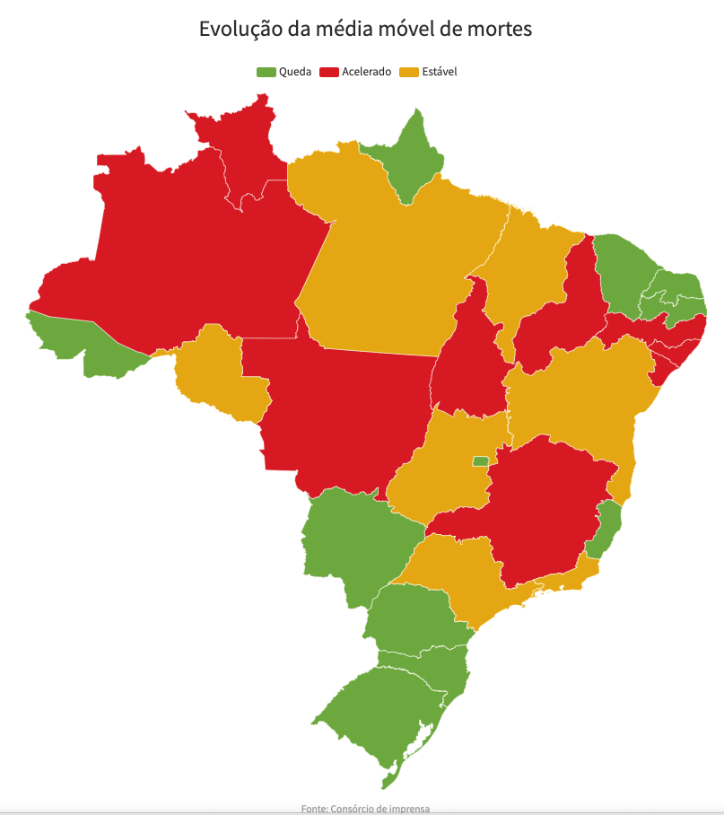 Com isso, a média móvel de mortes no Brasil nos últimos 7 dias foi de 1.001 –acima de mil pelo segundo dia seguido, de acordo com o cálculo do consórcio da imprensa. A variação foi de +1% em comparação à média de 14 dias atrás, indicando tendência de estabilidade nos óbitos pela doença.