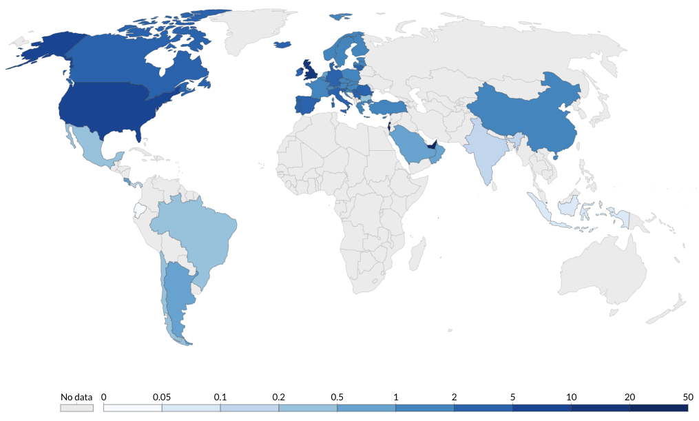 Ainda assim, o Brasil ultrapassou 39 países dos 54 que são monitorados, mesmo tendo sido um dos últimos países a começar a vacinação (em 17 de janeiro). O mapa da vacinação de Oxford revela uma lenta evolução da vacinação em todo o mundo, com a maioria dos países ainda sem imunizantes.