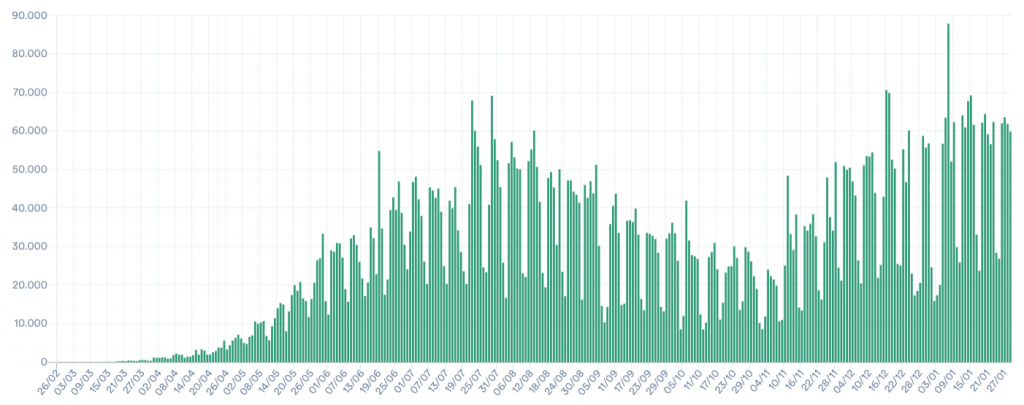 Já o total de pessoas infectadas pelo coronavírus desde o início da pandemia chegou a 9.118.513. Entre ontem e hoje, foram confirmados pelas autoridades de saúde 59.826 novos diagnósticos positivos de covid-19. Ontem, o sistema de dados do Ministério marcava 9.058.687 casos acumulados.