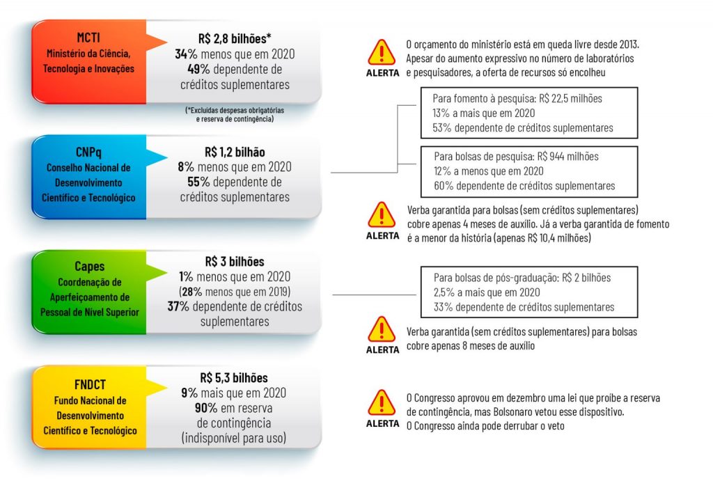 Isso corresponde, aproximadamente, a um terço do que o MCTI investia em pesquisa dez anos atrás; e pode ser considerado o menor orçamento da história do setor, levando-se em conta que o número de laboratórios e de pesquisadores que dependem desse orçamento para fazer suas pesquisas cresceu de forma substancial nas últimas décadas. Ou seja: temos um orçamento de pesquisa cada vez menor, para atender a uma população de pesquisadores cada vez maior — em plena pandemia.