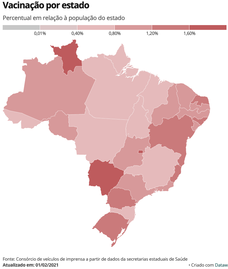 O total de 2.220.216 vacinados equivale a 1,05% da população brasileira. Com isso, o Brasil é o 42o. de uma lista de 58 países que vacinam no mundo.