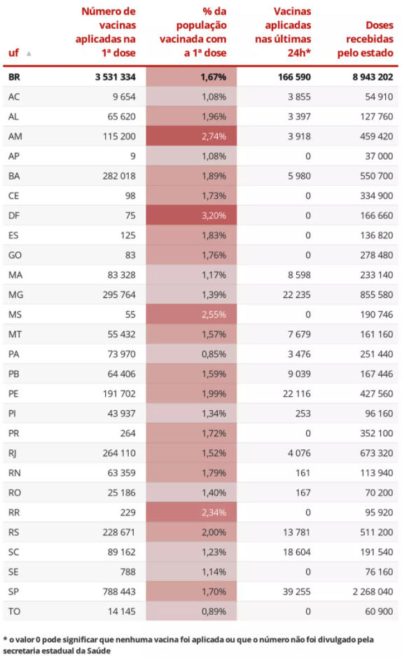 O total de 3.531.334 pessoas que receberam a 1ª dose equivale a 1,67% da população brasileira e 39,71% das doses recebidas pelos estados.