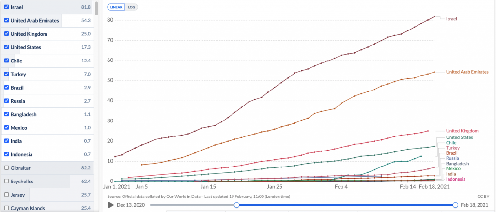 Desde o início da vacinação, o país do Oriente Médio vem sendo aquele com a maior aceleração na imunização da população. Hoje, o país passa de sete milhões de doses aplicadas, menos que EUA, Reino e Índia, apenas. O Brasil é o próximo com 6,21 milhões de doses aplicadas.