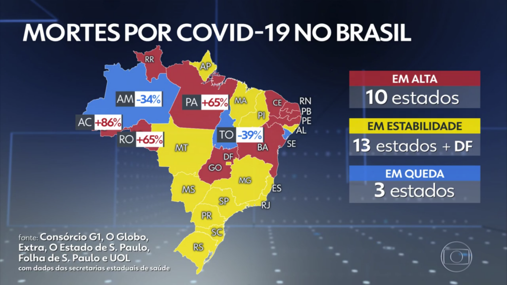 Dez estados estão com alta nas mortes: GO, AC, PA, RO, RR, BA, CE, PB, PE e RN. Doze e o Distrito Federal permanecem estáveis e apenas quatro estão em queda. O Centro-Oeste (18%) e o Nordeste (28%) apresentaram aceleração na média de óbitos. As demais estão estáveis: Norte (-7%), Sudeste (-3%) e Sul (11%).