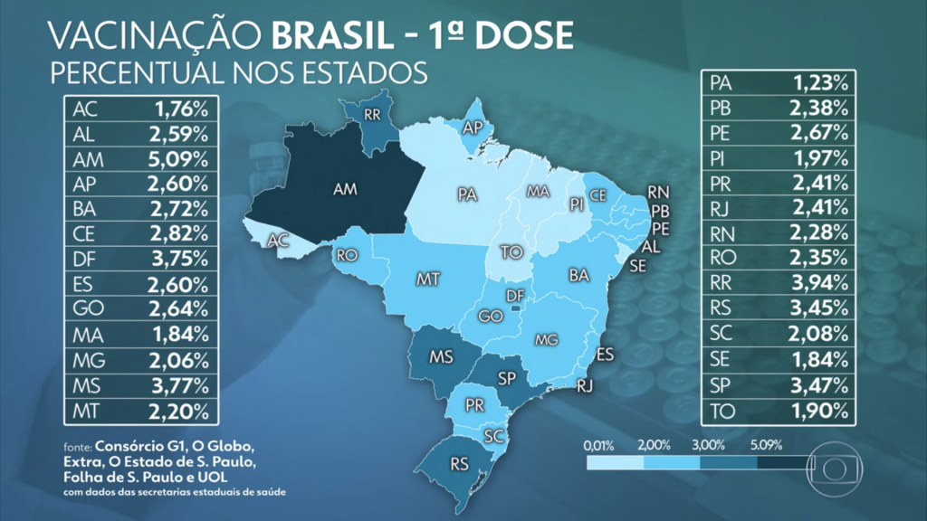 Balanço da vacinação contra Covid-19 desta sexta-feira (19) aponta que 5.756.502 de pessoas já receberam a primeira dose de vacina contra a Covid-19, segundo dados divulgados até as 20h. O número representa 2,72% da população brasileira.