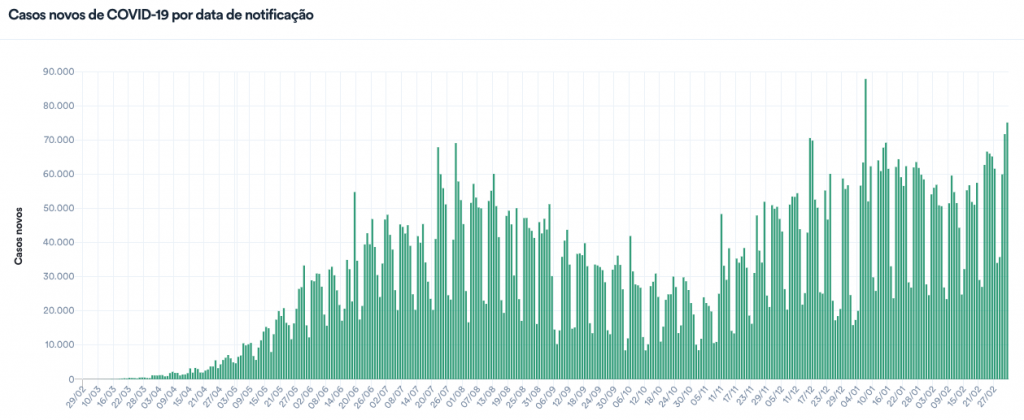Houve 75.102 casos confirmados de covid-19 no país de ontem para hoje. Primeiro recorde foi no dia 8 de janeiro, quando foram registrados 87.843, devido à falta de dados em alguns estados nos últimos dias.