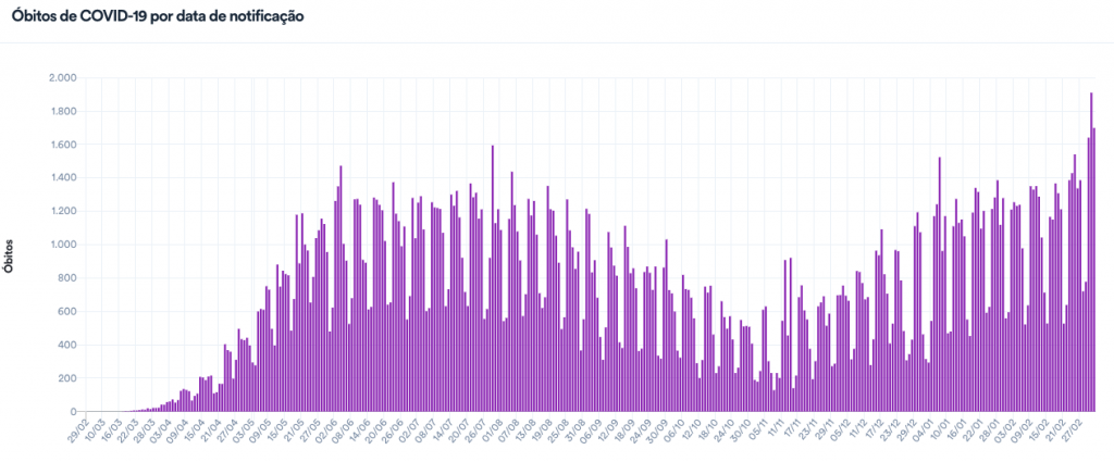 Ontem (3), pelos dados do Ministério, o Brasil teve o número mais alto de novas mortes por covid-19 em um intervalo de 24 horas: foram 1.910. O recorde anterior havia sido verificado um dia antes: em 2 de março, foram 1.641 vítimas.