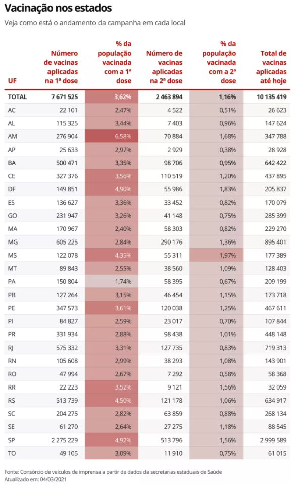 Balanço atualizado da vacinação aponta que 7.671.525 pessoas já receberam a primeira dose de vacina contra a Covid-19, segundo dados divulgados até as 20h. O número representa 3,62% da população brasileira.