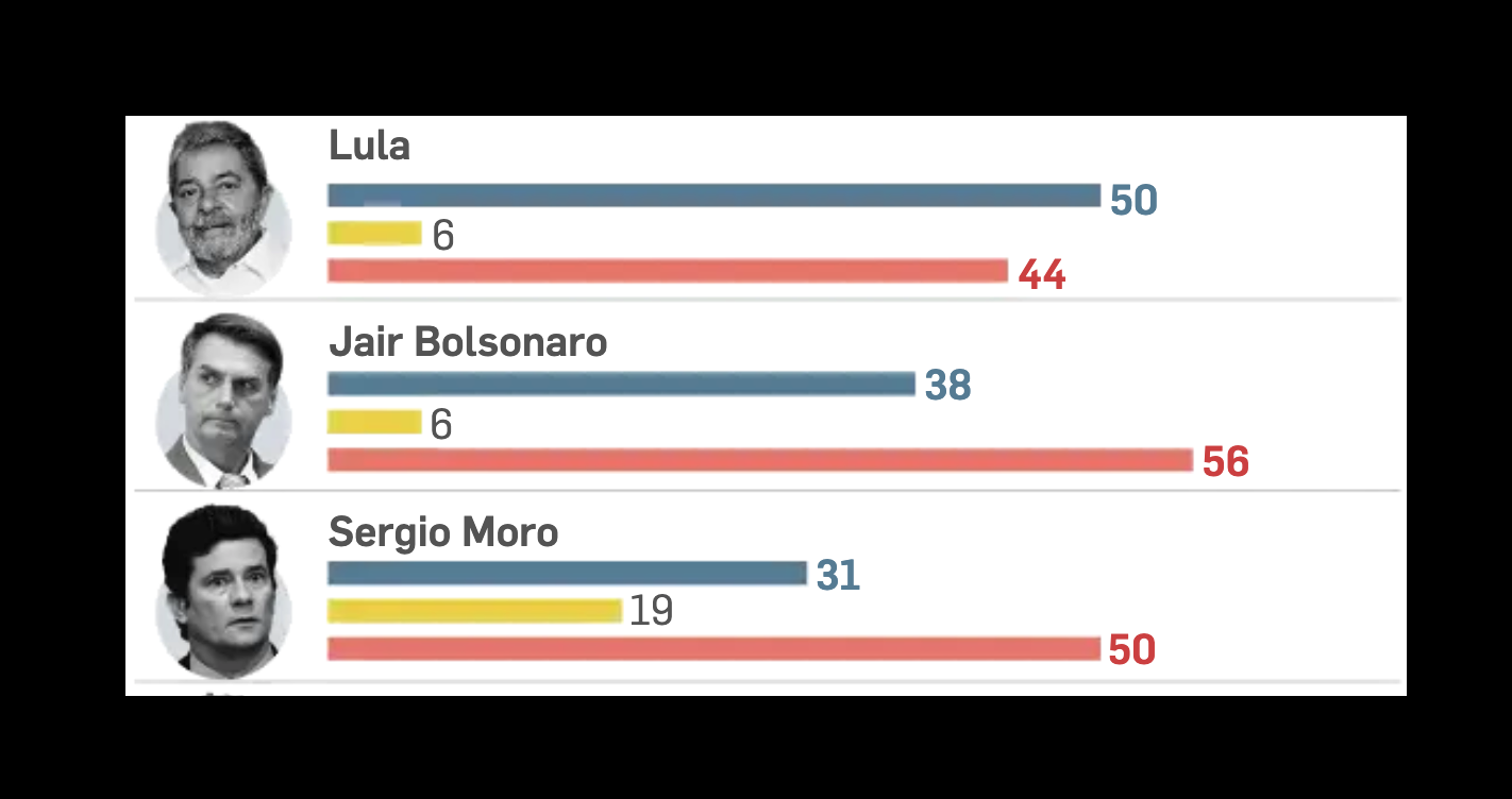 O levantamento do Ipec, 50% dos entrevistados disseram que votariam com certeza ou poderiam votar em Lula se ele se candidatasse novamente à Presidência, e 44% afirmaram que não o escolheriam de jeito nenhum. Bolsonaro aparece com 12 pontos porcentuais a menos no potencial de voto (38%), e 12 a mais na rejeição (56%).