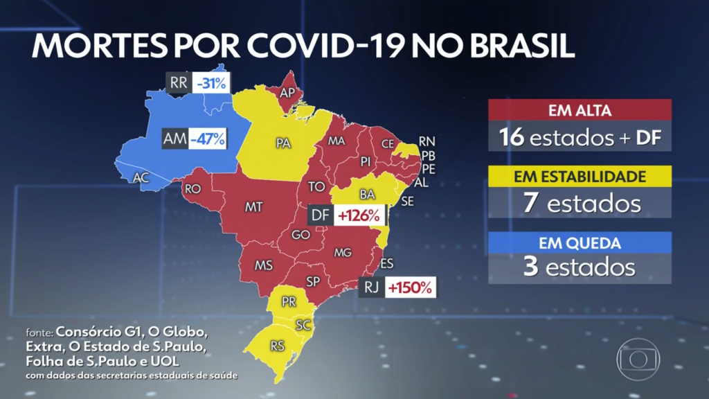 Treze estados e o Distrito Federal estão com alta nas mortes: ES, MG, RJ, SP, DF, MS, MT, AP, TO, CE, MA, PB, PE e PI.