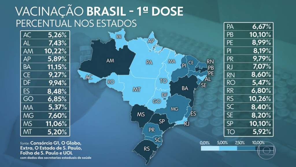 O ritmo de vacinação tem se acelerado, chegando a perto de um milhão de doses aplicadas por dia. No entanto, especialistas avaliam que o ritmo deve cair novamente com o atraso na entrega de novos imunizantes.