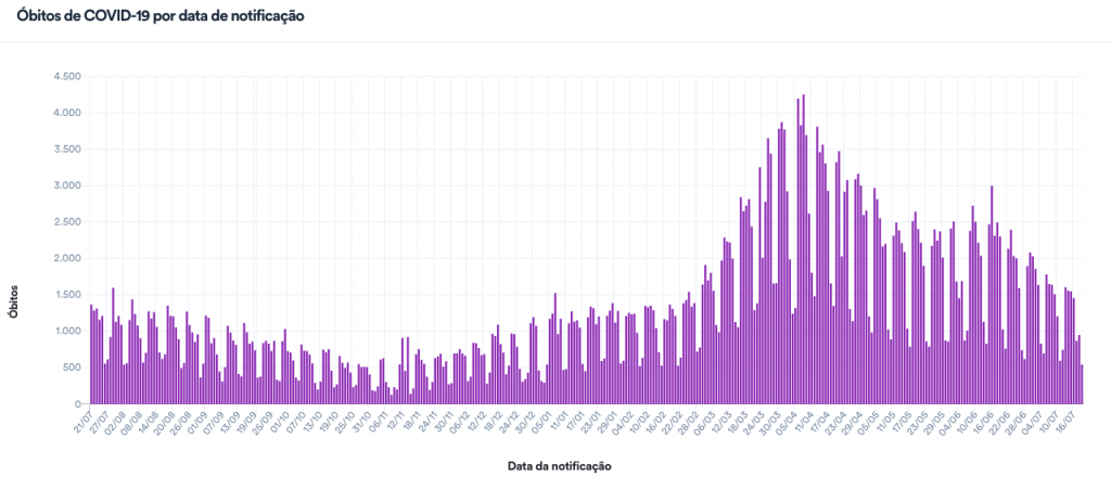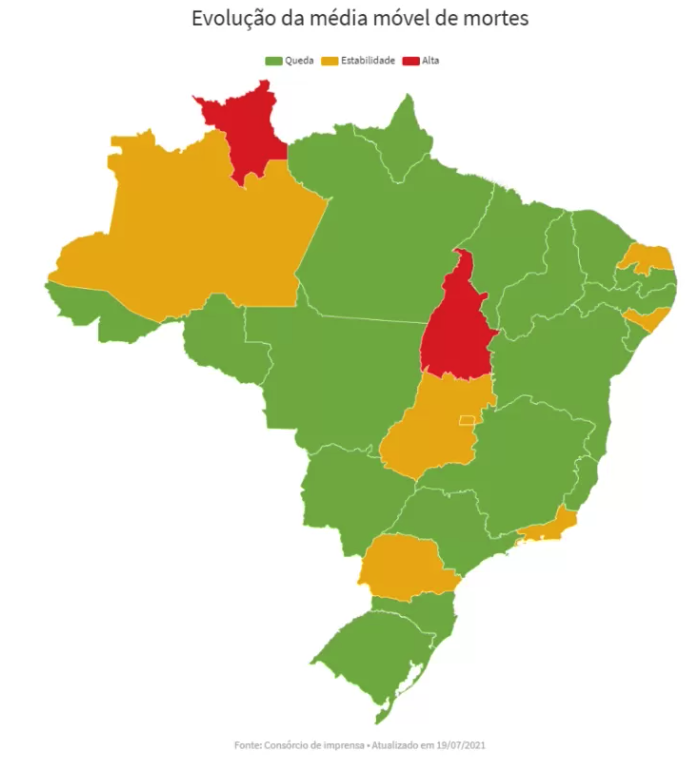 Com isso, a média móvel de mortes nos últimos 7 dias chegou a 1.224 – o menor registro desde o dia 1º de março (quando estava em 1.223). Em comparação à média de 14 dias atrás, a variação foi de -21% e aponta tendência de queda. É o 23º dia seguido de queda nesse comparativo.