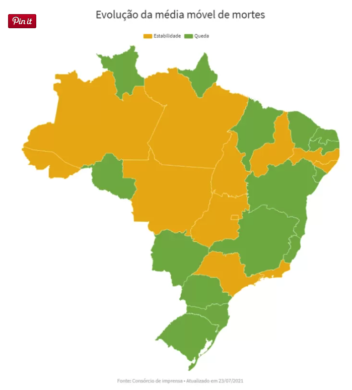 Nenhum estado apresenta tendência de alta nas mortes e 15 estados apresentam queda. No entanto, onze estados mais o DF estão com estabilidade nas mortes, saindo da desaceleração dos últimos dias.