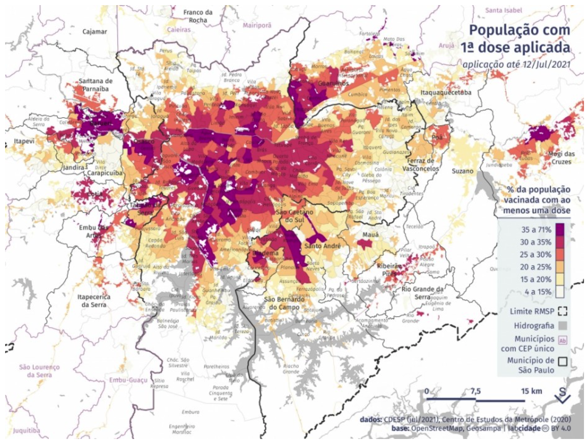 Estudo realizado por pesquisadores da Universidade de São Paulo (USP) mostrou que, na capital paulista, regiões periféricas do extremo Leste (Guaianases, Cidade Tiradentes e Itaim Paulista), da zona Norte (Brasilândia e Vila Medeiros) e da zona Sul (Campo Limpo e Capão Redondo, Capela do Socorro, Grajaú, Parelheiros e Marsilac) tiveram baixo percentual de pessoas vacinadas com a primeira dose entre a população maior de 40 anos.