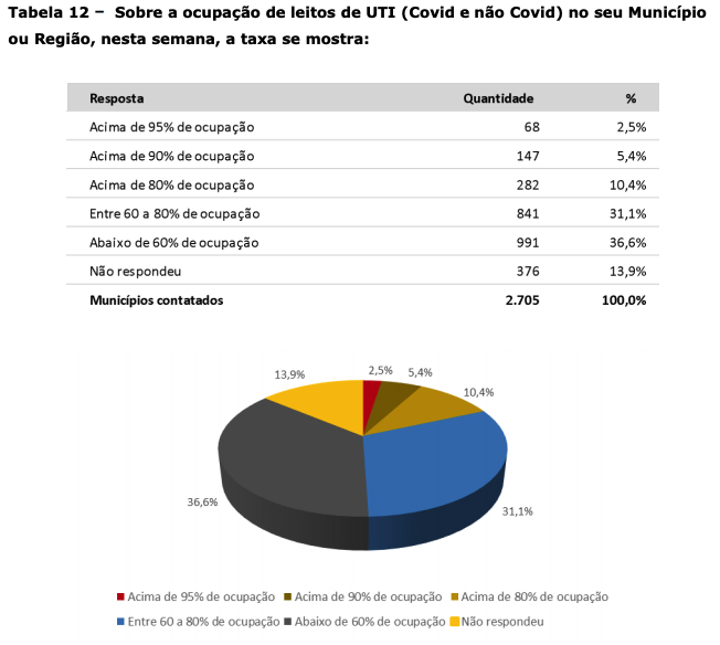 Do universo consultados, 1.532 (56,6%) administrações municipais disseram que até 10% das pessoas convocadas não apareceram para tomar a primeira dose. Quanto à aplicação da segunda dose, 1,334 (73,9%) das cidades informaram que menos de 10% do público alvo ainda não concluiu o ciclo vacinal.