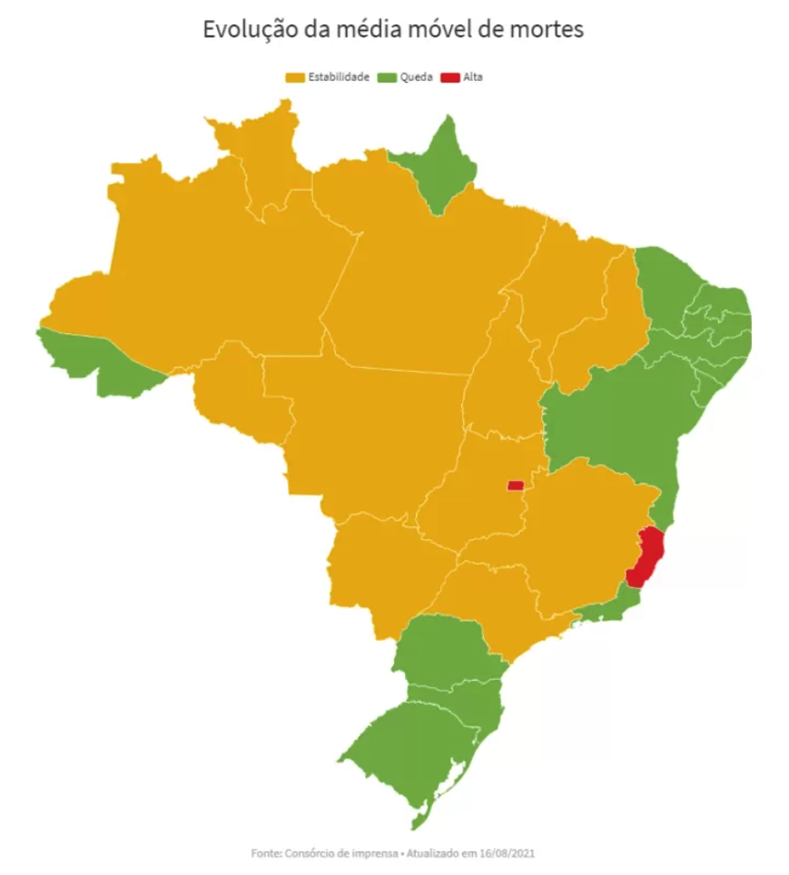 Apenas um estado e o Distrito Federal apresentam tendência de alta nas mortes: ES e DF. São 13 estados em desaceleração de óbitos (PR, SC, AP, RN, AC, PE, RJ, BA, AL, RS, CE, PB, SE) e outros 12 em estabilidade.