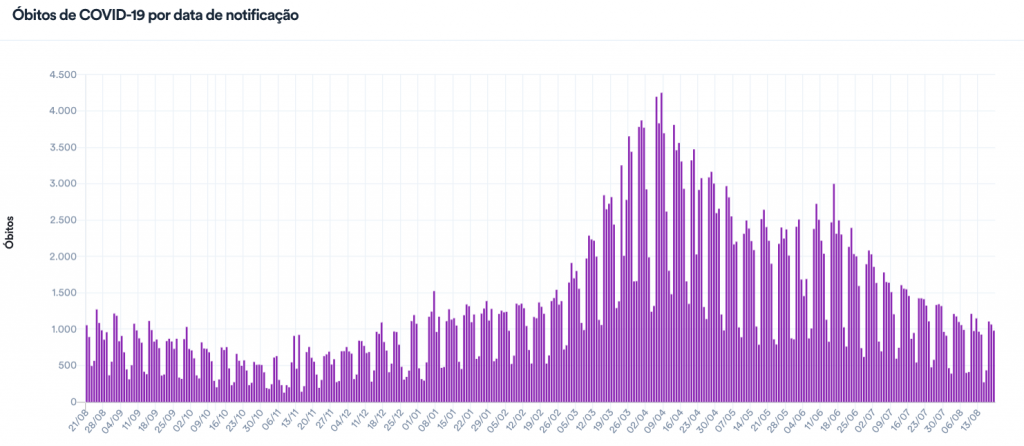 Com isso, a média móvel de mortes nos últimos 7 dias ficou em 821. Em comparação à média de 14 dias atrás, a variação foi de -9% e aponta tendência de estabilidade. É o 8º dia seguido de estabilidade, após um período de 12 dias em queda.