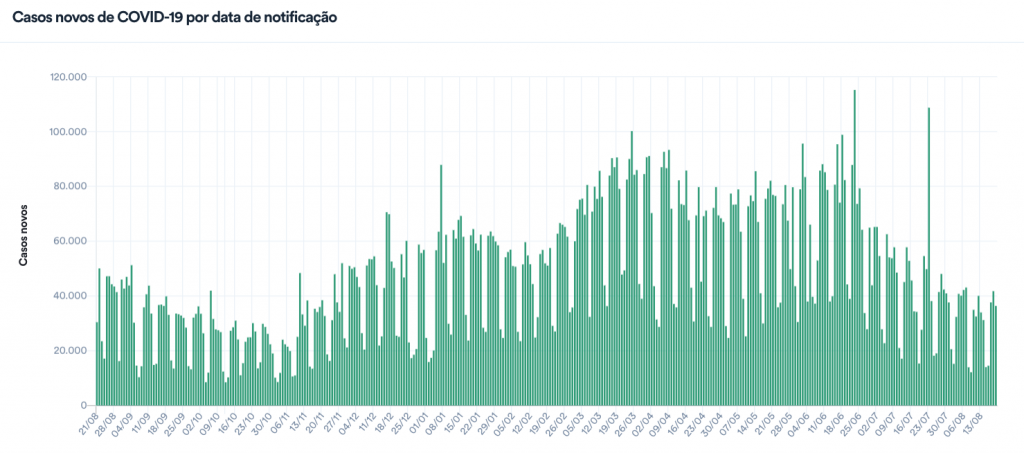 A média móvel nos últimos 7 dias foi de 29.895 diagnósticos por dia. Isso representa uma variação de -9% em relação aos casos registrados na média há duas semanas, o que indica estabilidade.