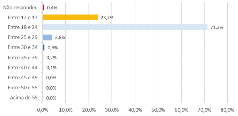 Do conjunto de cidades consultadas, 14 (0,6%) estão imunizando com a primeira dose pessoas de 30 a 34 anos, 89 (3,8%) estão na faixa etária de 25 a 29 anos, 1.669 (71,2%) estão na faixa de 18 a 24 anos e 556 (23,7%) já estão aplicando vacinas em pessoas de 12 a 17 anos.