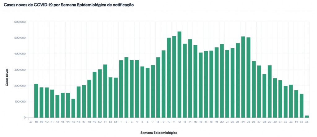 O estado de São Paulo é o que concentra o maior número de casos e de mortes por covid-19, com 4,29 milhões e 146.5 mil, respectivamente. Entre os casos, a segunda unidade da Federação com maior número de casos é Minas Gerais (2,08 milhões) e a terceira é o Paraná (1,46 milhão). Os estados com menos casos são Acre (87.875), Amapá (122,5 mil) e Roraima (122,4 mil).