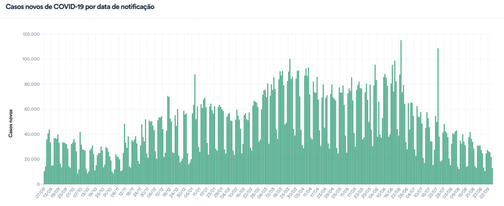 Os dados em geral são menores aos domingos e segundas-feiras em razão da dificuldade de alimentação do sistema pelas secretarias estaduais. Já às terças-feiras os resultados tendem a ser maiores pela regularização dos registros acumulados durante o fim de semana.
