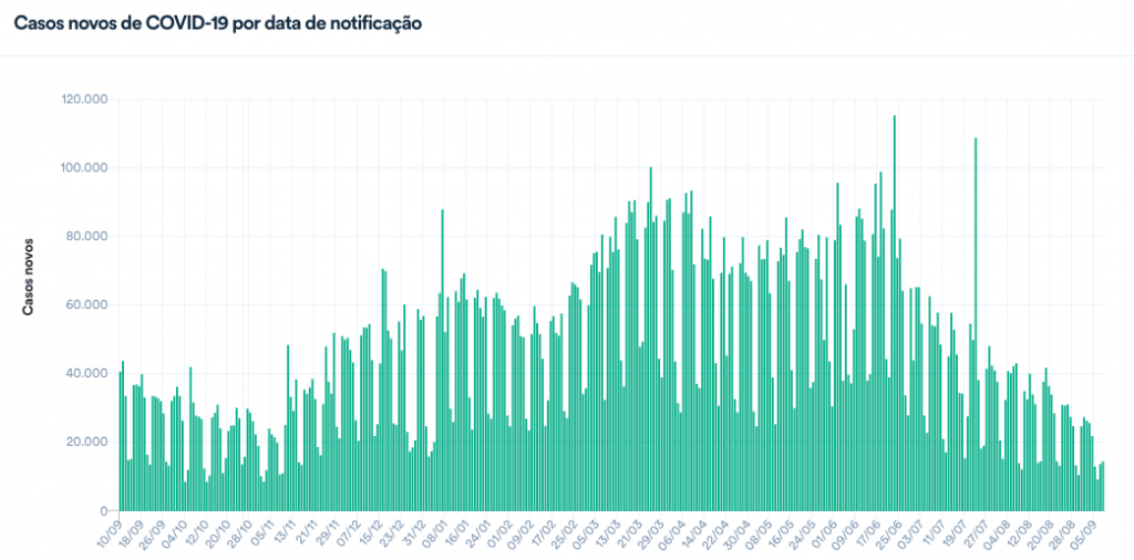 Com os novos casos, o total de pessoas infectadas pelo novo coronavírus chegou a 20.958.899. A média móvel de casos está em 20,1 mil, a menor desde o início do ano conforme o Ministério da Saúde.