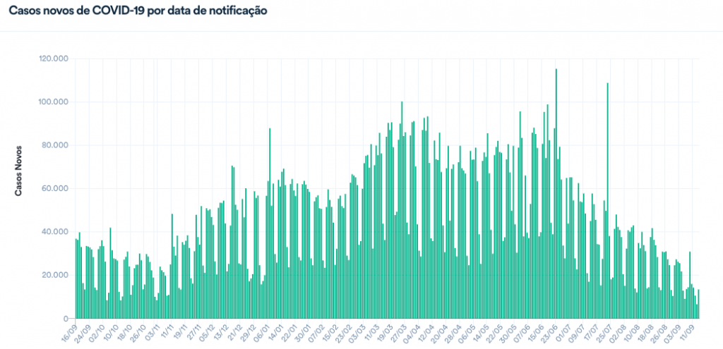 A média móvel nos últimos 7 dias foi de 15.165 diagnósticos por dia – o menor número registrado desde 20 de maio de 2020 (quando estava em 14.647) –resultando em uma variação de -33% em relação aos casos registrados na média há duas semanas, o que indica queda.