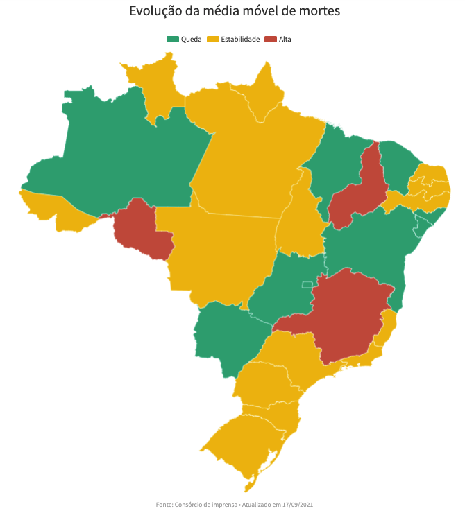Três estados aparecem com tendência de alta nas mortes: Minas Gerais, Rondônia e Piauí. No outro extremo estáo Amapá e Rondônia, que não registraram mortes em seus boletins do último dia. O estado de RO, no entanto, reduziu em 2 o total de mortes após verificar casos de duplicidade.