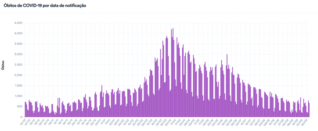 Total de óbitos desde o início da pandemia se aproxima de 600 mil, número que deve ser alcançado em uma semana, considerando a média atual de 544 mortes diárias.