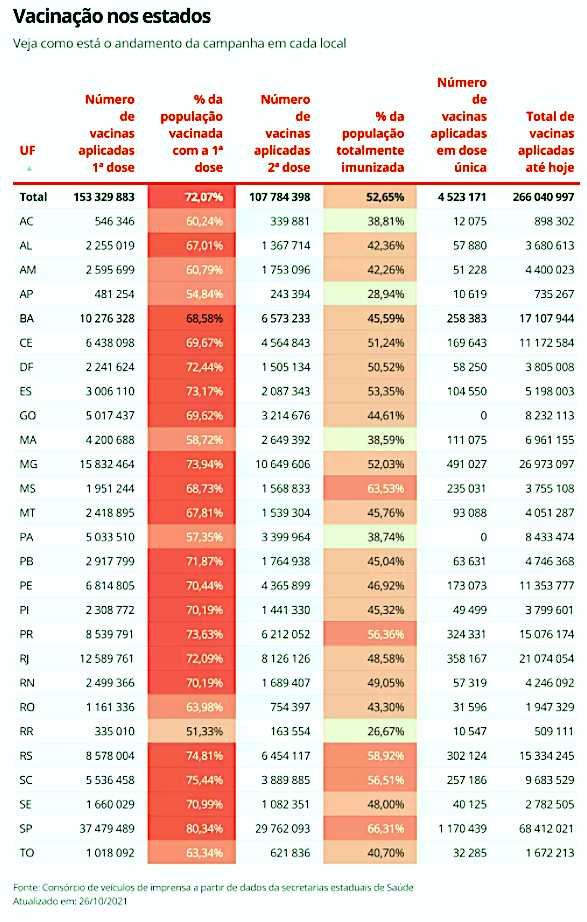 Os estados com maior porcentagem da população imunizada (com segunda dose ou dose única) são: São Paulo (66,31%), Mato Grosso do Sul (63,53%), Rio Grande do Sul (58,92%), Santa Catarina (56,51%) e Paraná (56,36%).