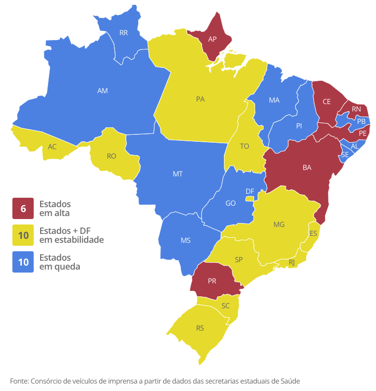 A aceleração de mortes ocorre em 6 estados (AP, RN, PR, PE, BA, CE), enquanto dez estados mais o DF estabilizaram.