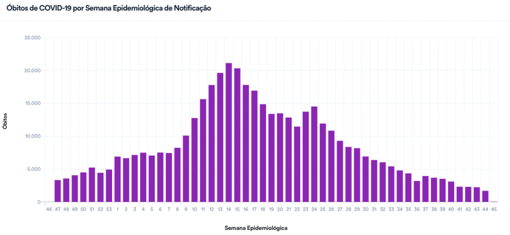 Com isso, a média móvel de mortes nos últimos 7 dias ficou em 235 –abaixo da marca de 250 pelo 6º dia (e abaixo de 300 pelo 8º dia). Em comparação à média de 14 dias atrás, a variação foi de -31% e aponta queda pelo oitavo dia seguido. Há uma semana o país mantém tendência de queda expressiva nesse comparativo, com ao menos 30% de diminuição todos os dias.