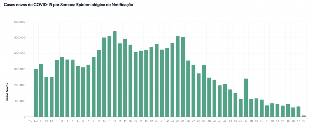 Covid-19: Brasil tem 22 milhões de casos e 614,3 mil mortes. País registra 62,44% de brasileiros totalmente imunizados.