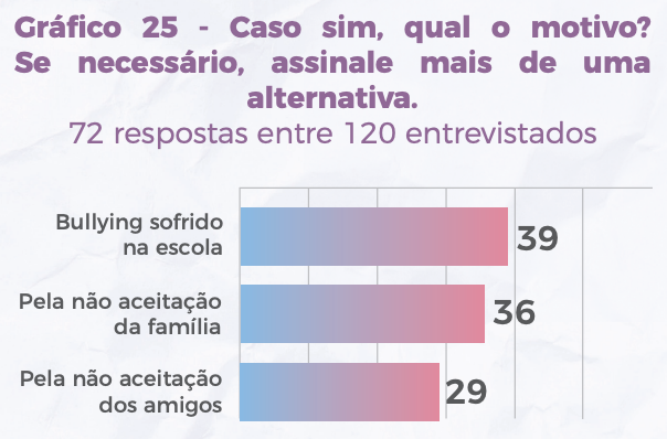 Foram entrevistadas 120 pais, mães e responsáveis que reconhecem ter uma criança ou adolescente transgênero, moradores de 62 cidades em 17 estados brasileiros. Entre as pessoas entrevistadas, 77,5% informaram que seus filhos, crianças e adolescentes, entre 5 e 17 anos, já foram vítimas de bullying transfóbico no ambiente escolar.