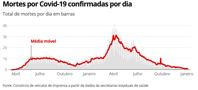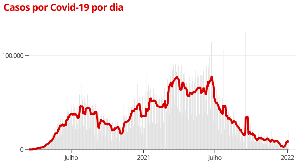 Com os novos casos, o total de pessoas infectadas pelo novo coronavírus chegou a 22.323.837. O número de casos ativos voltou a ultrapassar os 100 mil após semanas abaixo dessa marca. Segundo a atualização de hoje, há 100.499 com covid-19. Já a média móvel de casos está em 9.874 após o apagão de dados nos sistemas do Ministério da Saúde que segue dificultando os balanços de alguns estados. O aumento foi de 253%.