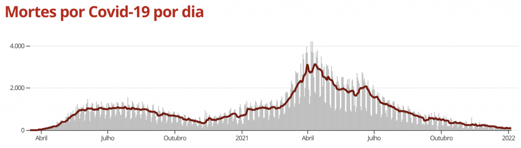 Em comparação à média de 14 dias atrás, a variação foi de -2%, indicando tendência de estabilidade nos óbitos decorrentes da doença.